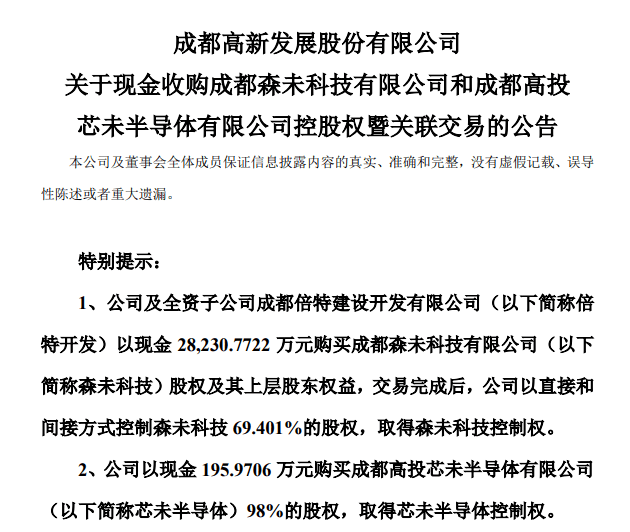 6月19日,成都高新發(fā)展股份有限公司(簡稱“高新發(fā)展”)發(fā)布公告,公司及全資子公司成都倍特公司(簡稱“倍特開發(fā)”)將以現(xiàn)金2.82億元購買成都森未科技有限公司(以下簡稱“森未科技”)股權(quán)及其上層股東權(quán)益。
