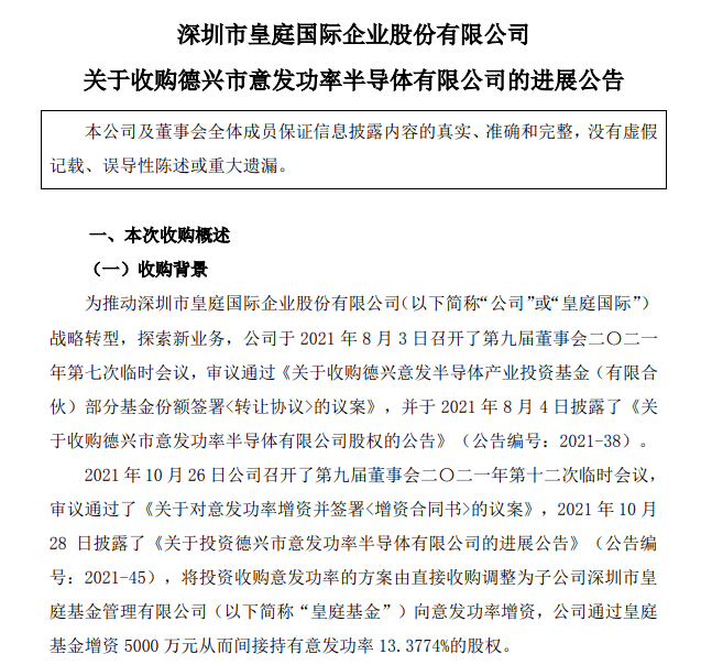 6月17日,深圳市皇庭國際企業(yè)股份有限公司(以下簡稱“皇庭國際”)發(fā)布公告稱,公司全資子公司深圳市皇庭基金管理有限公司(以下簡稱“皇庭基金”)近日簽署股權(quán)轉(zhuǎn)讓協(xié)議,擬收購ZHOU BING和寧波意發(fā)分別持有的德興市意發(fā)功率半導(dǎo)體有限公司(簡稱“意發(fā)功率”)9.67%、4.76%股權(quán),價(jià)格分別為5561萬元和2739萬元。