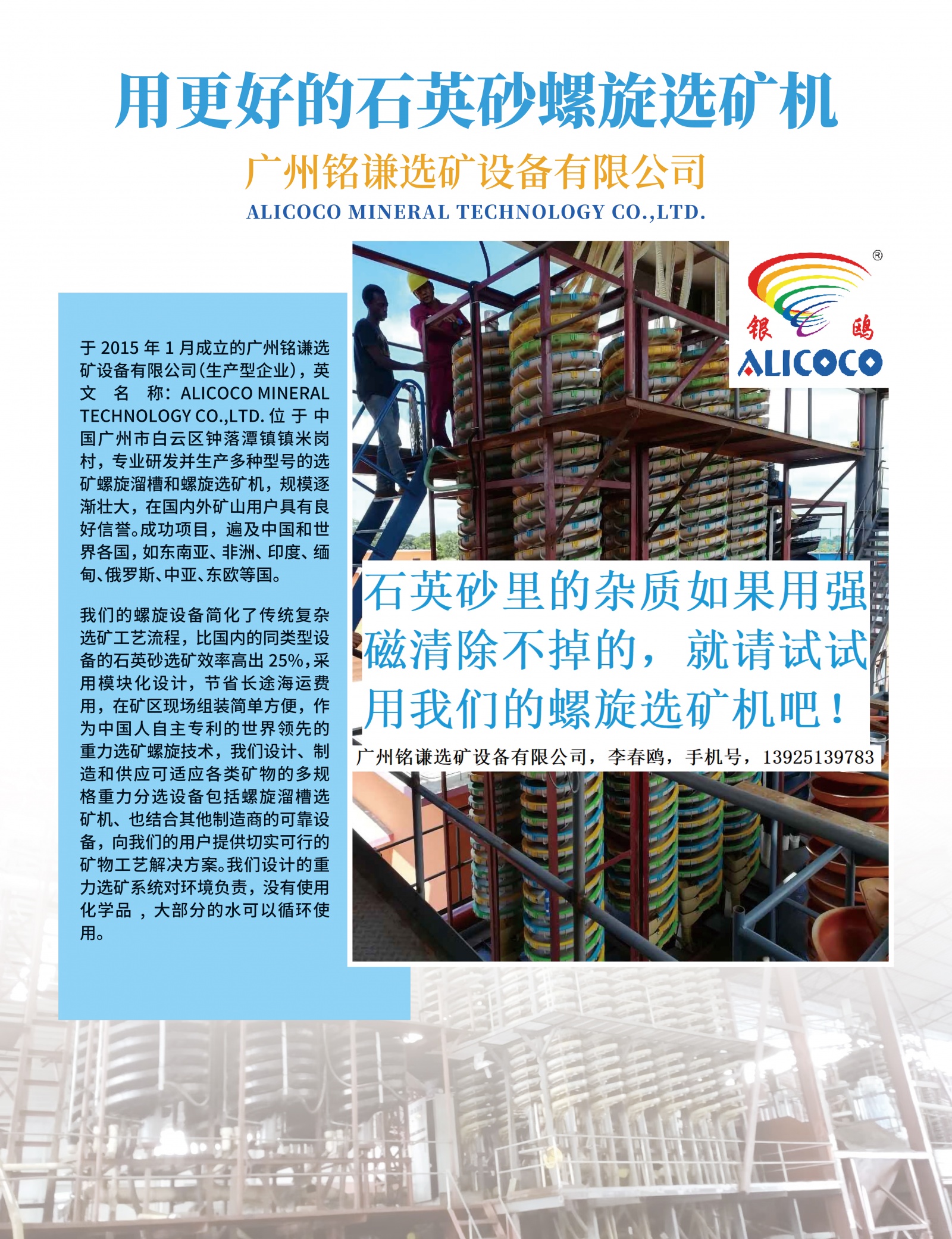 于 2015 年1月成立的廣州銘謙選礦設備有限公司(生產(chǎn)型企業(yè)),英文名稱:ALICOCO MINERALTECHNOLOGY COLLTD位于中國廣州市白云區(qū)鐘落潭鎮(zhèn)鎮(zhèn)米崗村,專業(yè)研發(fā)并生產(chǎn)多種型號的選礦螺旋溜槽和螺旋選礦機,規(guī)模逐漸壯大,在國內(nèi)外礦山用戶具有良好信譽。成功項目。遍及中國和世界各國,如東南亞 非洲,印度、緬甸、俄羅斯、中亞、東歐等國。