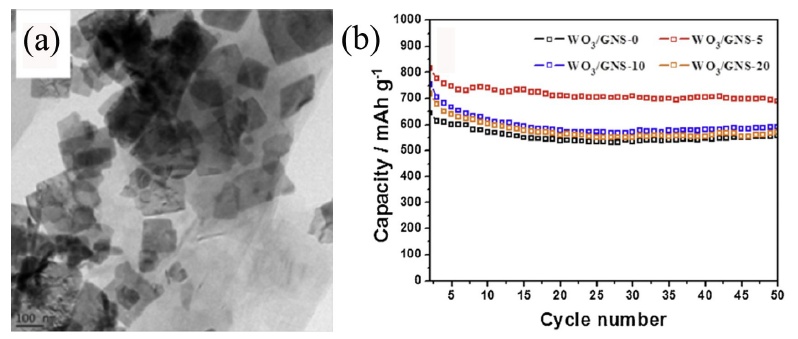 Kim等通過水熱法合成了WO3納米板與石墨烯納米片的復(fù)合材料,并在電流密度為80mAg-1條件下分別測(cè)定了純相和復(fù)合5wt%、10wt%和20wt%石墨烯的循環(huán)性能曲線,見圖1。復(fù)合不同量石墨烯的放電比容量和循環(huán)穩(wěn)定性均高于純WO3的,并且復(fù)合石墨烯的量為5wt%時(shí)性能最佳。性能的提高可以歸結(jié)于石墨烯的加入增加了材料的電導(dǎo)率,WO3作為活性物質(zhì),石墨烯作為優(yōu)良的電子導(dǎo)體,良好的接觸,使得電極材料的性能有所提高。