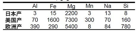 日本產(chǎn)、美國產(chǎn)和歐洲產(chǎn)的石灰石中的雜質(zhì)含量比率測量結(jié)果示例(μg/g)