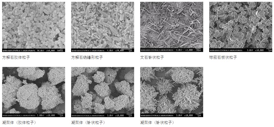 通過以上二種碳化方式的組合,可以制備無定形、立方體、柱形、紡錘形、片狀、球形、針狀等50多種不同晶形和大小的碳酸鈣,粒徑在20-5000nm可調(diào)。