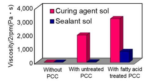 上圖是雙組份聚氨酯膠的粘度變化,從圖左邊開始分別為未混合PCC、混合了未處理PCC以及混合了經(jīng)過脂肪酸處理后的PCC的膠劑。可以看出,使用脂肪酸改變表面性質(zhì)后,可以提高密封膠作業(yè)的效率。
