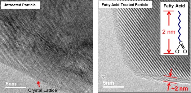 上圖未處理產(chǎn)品和脂肪酸處理產(chǎn)品的粒子表面的透射電子顯微鏡(TEM)圖像。左側(cè)未處理產(chǎn)品中,可以看到粒子的表面附近都有方解石晶格;而右側(cè)脂肪酸處理產(chǎn)品中,由于存在脂肪酸,粒子表面可以觀察到約2nm厚的層狀物質(zhì)。通過進(jìn)行均質(zhì)的表面處理,可以獲得穩(wěn)定的填料性能。