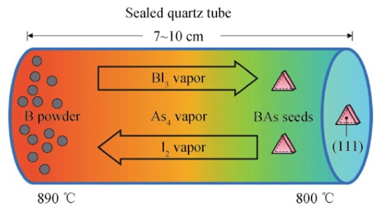 BAs晶體難以制備主要受到以下因素影響:(1)硼的熔點(2076℃)遠高于砷的升華溫度(614℃);(2)砷及相關(guān)反應(yīng)物具有毒性;(3)硼的化學(xué)穩(wěn)定性很強,很難反應(yīng);(4)生長溫度超過920℃時BAs會分解為更加穩(wěn)定的亞晶相(B12As2)。因此很難像GaAs等其他Ⅲ-Ⅴ族半導(dǎo)體材料那樣采用熔體法進行晶體生長。CVT可在密閉環(huán)境下通過多溫區(qū)精確控溫實現(xiàn)化學(xué)反應(yīng)控制,有效解決了上述問題,是目前開展BAs單晶制備研究的主要方法。