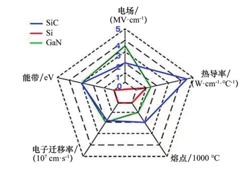 第三代半導(dǎo)體指的是SiC、GaN、ZnO、金剛石(C)、AlN等具有寬禁帶(Eg>2.3eV)特性的新興半導(dǎo)體材料。以第三代寬禁帶功率半導(dǎo)體的典型代表SiC和GaN為例,其材料特性與Si材料的特性對比如下圖所示: