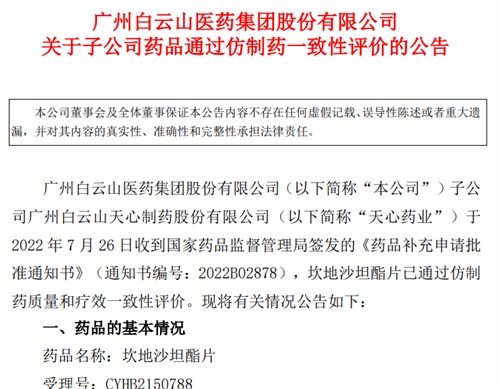 中國粉體網(wǎng)訊 廣州白云山醫(yī)藥集團(tuán)股份有限公司(簡稱“本公司”)子公司廣州白云山天心制藥股份有限公司(簡稱“天心藥業(yè)”)于2022年7月26日收到國家藥品監(jiān)督管理局簽發(fā)的《藥品補(bǔ)充申請批準(zhǔn)通知書》(通知書編號:2022B02878),坎地沙坦酯片已通過仿制藥質(zhì)量和療效一致性評價。