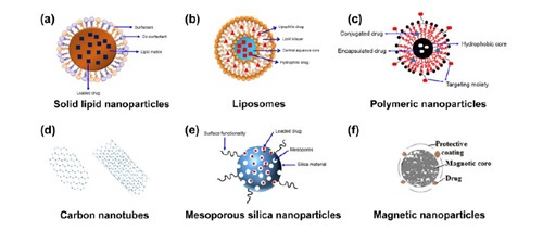 代表性抗腫瘤藥物輸送納米載體:固體脂質(zhì)納米顆粒(a)、脂質(zhì)體結(jié)構(gòu)(b)、聚合物納米顆粒(c)、碳納米管(d)、介孔硅納米顆粒(e)和磁性納米顆粒(f)