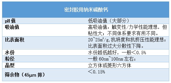整體而言,影響密封膠專用納米碳酸鈣在密封膠中摻和性能的因素主要是有粒徑、晶型、吸油值、比表面積、pH值、篩余物、水分;影響交替觸變性的因素主要是顆粒形態(tài)、吸油值、表面改性和pH值;影響增強(qiáng)作用的因素主要有∶粒徑、分散性。