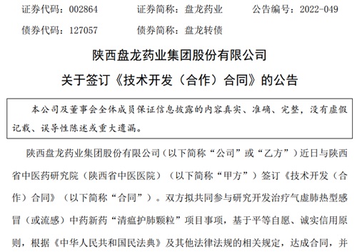 中國粉體網(wǎng)訊 陜西盤龍藥業(yè)集團(tuán)股份有限公司(“公司”)近日與陜西省中醫(yī)藥研究院(陜西省中醫(yī)醫(yī)院)簽訂《技術(shù)開發(fā)(合作)合同》(“合同”)。雙方擬共同參與研究開發(fā)治療氣虛肺熱型感冒(或流感)中藥新藥“清瘟護(hù)肺顆!表(xiàng)目事項(xiàng),基于平等自愿、誠實(shí)信用原則,根據(jù)《中華人民共和國民法典》及其他法律法規(guī)的相關(guān)規(guī)定,達(dá)成合同,并由雙方共同恪守。