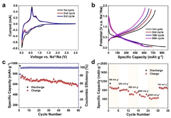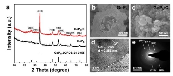 作者合成了GeP5/C復(fù)合材料,并采用多模型表征技術(shù)對鈉的儲存機(jī)理進(jìn)行了綜合研究;谵D(zhuǎn)化和合金化的多步反應(yīng)過程提供了947mAh/g的高初始容量。放電產(chǎn)物NaxP和NaGe的協(xié)同作用增強(qiáng)了電化學(xué)性能以及結(jié)構(gòu)和形態(tài)的穩(wěn)定性。經(jīng)過60次循環(huán)后,GeP5/C復(fù)合電極即使在1000mA/g的高電流密度下,鈉的存儲容量也顯示為578mAh/g。這些結(jié)果為了解P基負(fù)極的鈉離子儲存機(jī)理提供了基礎(chǔ)知識,并為開發(fā)先進(jìn)的SIBs負(fù)極材料提供了有價值的信息。