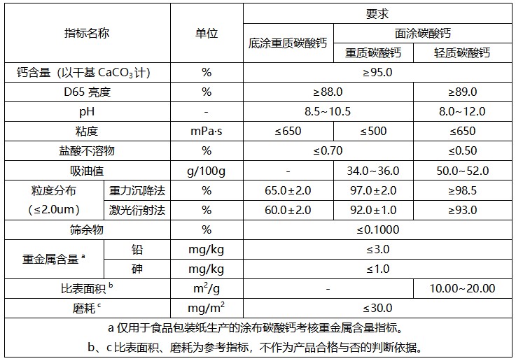 涂布級(jí)碳酸鈣的技術(shù)指標(biāo)要求(QB/T2811-2019造紙用碳酸鈣)