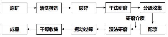 將原礦經(jīng)洗選后兩段破碎至400目左右,配制成一定濃度的漿液,加入研磨助劑,給入立式研磨機(jī),以氧化鋯珠作為研磨介質(zhì),通過(guò)調(diào)整磨機(jī)各項(xiàng)參數(shù)控制出料細(xì)度,物料經(jīng)磨細(xì)后以漿料形式排出,經(jīng)干燥除塵后收集而成。