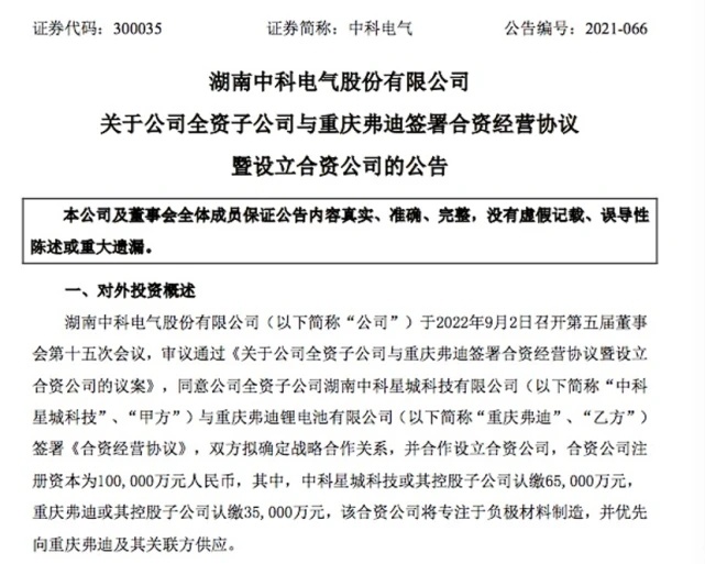 中科電氣披露公告顯示,全資子公司中科星城科技與重慶弗迪簽署合資經(jīng)營(yíng)協(xié)議,雙方擬確定戰(zhàn)略合作關(guān)系,并合作設(shè)立合資公司。