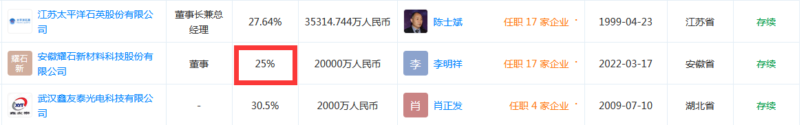 據(jù)中國粉體網(wǎng)了解,安徽耀石新材料科技股份有限公司成立于2022年3月,位于安徽省蕪湖市, 是一家以從事科技推廣和應(yīng)用服務(wù)業(yè)為主的企業(yè)。其董事局主席陳士斌,是江蘇太平洋石英股份有限公司董事長。天眼查顯示,陳士斌在安徽耀石新材料的投資比例占25%。