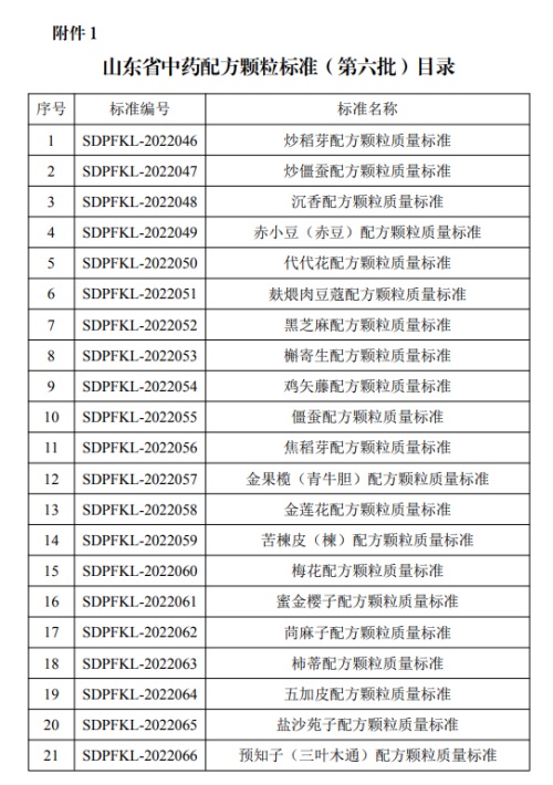 根據(jù)《藥品管理法》《國家藥監(jiān)局 國家中醫(yī)藥局 國家衛(wèi)生健康委 國家醫(yī)保局關(guān)于結(jié)束中藥配方顆粒試點工作的公告》(2021年第22號)有關(guān)規(guī)定,按照《國家藥監(jiān)局關(guān)于發(fā)布〈中藥配方顆粒質(zhì)量控制與標準制定技術(shù)要求〉的通告》(2021年第16號)及國家藥品標準制定相關(guān)程序,我局已組織完成第六批21個中藥配方顆粒標準的審定,現(xiàn)予以發(fā)布,自公告之日起正式實施。如有同品種的中藥配方顆粒國家藥品標準頒布實施,我省制定的相應中藥配方顆粒標準即行廢止。
