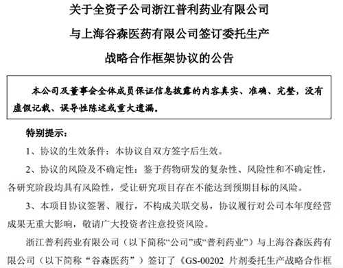中國粉體網(wǎng)訊 9月13日,普利制藥發(fā)布公告,子公司浙江普利藥業(yè)有限公司(“浙江普利藥業(yè)”)與上海谷森醫(yī)藥有限公司(“谷森醫(yī)藥”)簽訂了《GS-00202片劑委托生產(chǎn)戰(zhàn)略合作框架協(xié)議》協(xié)議,雙方本著“平等自愿、資源共享、優(yōu)勢互補、協(xié)同發(fā)展”的原則開展合作,谷森醫(yī)藥作為GS-00202片劑項目的藥品上市許可持有人(MAH),雙方同意建立長期合作,利用普利藥業(yè)符合歐美及國內(nèi)cGMP固體制劑生產(chǎn)體系優(yōu)勢,為谷森醫(yī)藥面向國內(nèi)外市場的臨床批、驗證批和商業(yè)批提供片劑的委托生產(chǎn)服務。