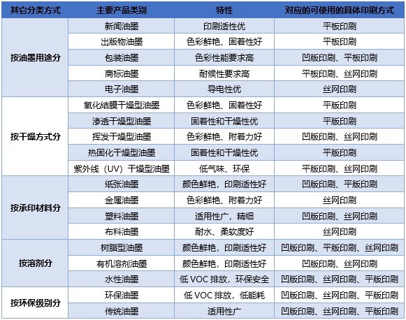 依據(jù)不同標(biāo)準(zhǔn),油墨可以劃分為不同種類,除按照印刷方式分類以外的其他分類如下: