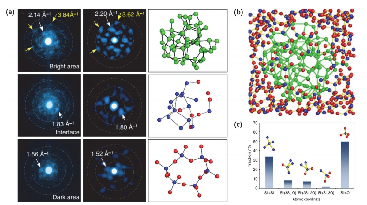 2016年,Chen等首次報(bào)道了非晶態(tài)SiO原子尺度不平衡的相關(guān)實(shí)驗(yàn)證據(jù),他們用埃束電子衍射(ABED),在Si/SiO2界面層檢測(cè)到對(duì)應(yīng)SiOx四面體的坐標(biāo);根據(jù)ABED和同步輻射X射線散射結(jié)果,結(jié)合計(jì)算機(jī)模擬,該團(tuán)隊(duì)提出了歧化型SiO的結(jié)構(gòu)模型。
