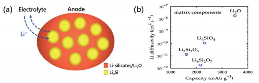 此外,不可逆基質(zhì)中,硅酸鋰鹽所占比例顯著高于Li2O,盡管Li2O在鋰化組分中所占比例較小,但Li+在Li2O中的擴(kuò)散速率比在硅酸鋰鹽中的擴(kuò)散速率高出至少兩個(gè)數(shù)量級(jí)。因此,它可以作為L(zhǎng)i+傳輸通道,進(jìn)而提高SiOx負(fù)極的容量和倍率性能。