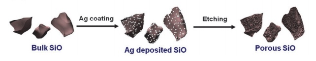 利用Ag催化刻蝕制備多孔SiO的過(guò)程示意圖(來(lái)源:朱思穎等,《鋰離子電池氧化亞硅負(fù)極結(jié)構(gòu)優(yōu)化和界面改性研究進(jìn)展》)
