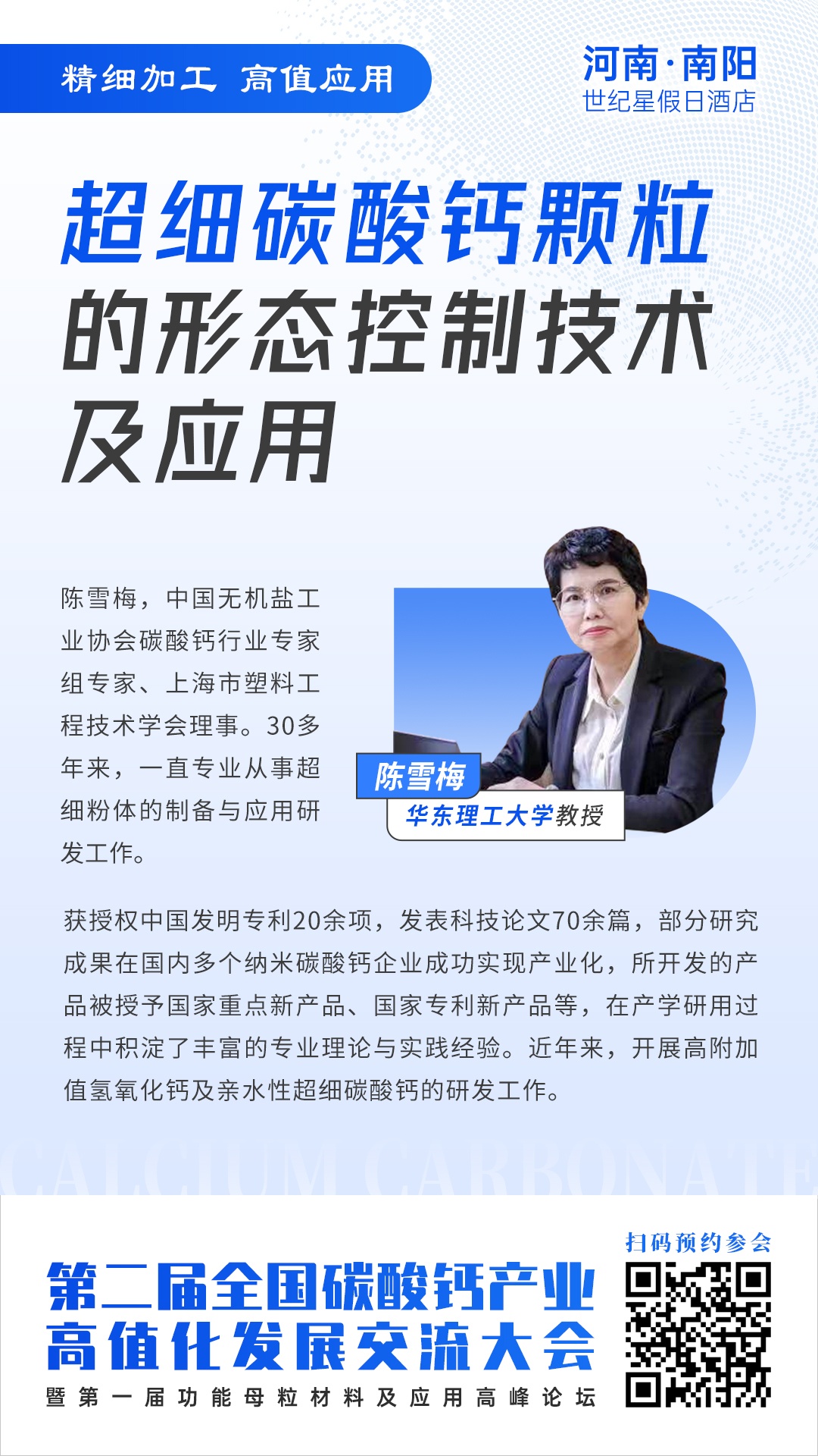 3月16~17日,第二屆全國碳酸鈣產(chǎn)業(yè)高值化發(fā)展交流大會(huì)將在河南·南陽舉行,屆時(shí)中國無機(jī)鹽工業(yè)協(xié)會(huì)碳酸鈣行業(yè)專家組專家、上海市塑料工程技術(shù)學(xué)會(huì)理事、華東理工大學(xué)陳雪梅教授將在大會(huì)上做“超細(xì)碳酸鈣顆粒的形態(tài)控制技術(shù)及應(yīng)用”的學(xué)術(shù)報(bào)告,全面深入的闡述主題內(nèi)容,與參會(huì)人員開展深入交流,解答技術(shù)難題,心動(dòng)就要行動(dòng),現(xiàn)在就可了解。