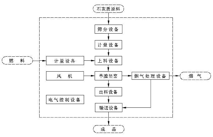 使用塊狀燃料的石灰煅燒成套裝備,由篩分設備、計量設備、上料設備、單膛豎窯、風機、出料設備、輸送設備、煙氣處理設備和電氣控制設備組成。