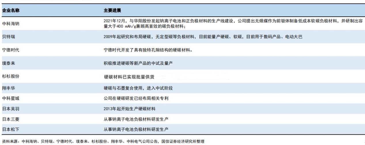 鈉離子電池負(fù)極生產(chǎn)企業(yè)及主要進(jìn)展