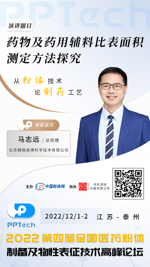 由于比表面積測定在藥品研究中應(yīng)用廣泛,因此,對于藥物及藥用輔料比表面積測定方法的研究一直在精益求精。為滿足廣大制藥企業(yè)及新老客戶對行業(yè)前沿的需求,中國粉體網(wǎng)將于2022年12月1-2日在江蘇泰州碧桂園鳳凰酒店舉辦“第四屆全國醫(yī)藥粉體制備及物性表征技術(shù)高峰論壇”,屆時邀請來自北京精微高博科學(xué)技術(shù)有限公司的馬志遠(yuǎn)總經(jīng)理作《藥物及藥用輔料比表面積測定方法探究》報告,報告主講人將結(jié)合藥品制造過程中的具體實例,如:列舉藥物及藥用輔料比表面積測試的關(guān)注指標(biāo)、深度分析比表面積測試實驗數(shù)據(jù),從多個角度講述不同技術(shù)要點。同時,通過對北京精微高博科學(xué)技術(shù)有限公司設(shè)備、技術(shù)方案、應(yīng)用范圍一一介紹,帶大家一窺市場態(tài)勢。