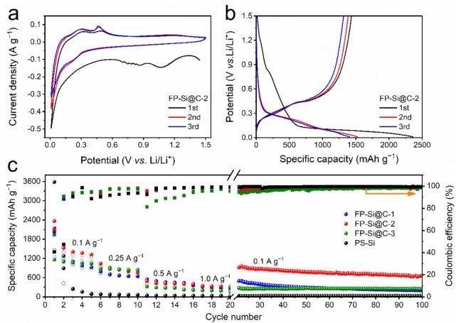 圖2.FP-Si@C-2復(fù)合負極在半電池中的儲鋰性能:(a)前三周的CV曲線(掃速為0.1mVs-1);(b)前三周的GCD曲線(電流密度為0.1Ag-1);(c)倍率性能和循環(huán)穩(wěn)定性。
