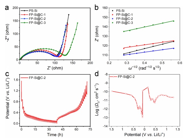 圖3.FP-Si@C-2復(fù)合負極的動力學分析:(a)EIS譜圖;(b)Z′和ω-1/2的擬合曲線;(c)GITT曲線;(d)Li+擴散系數(shù)。