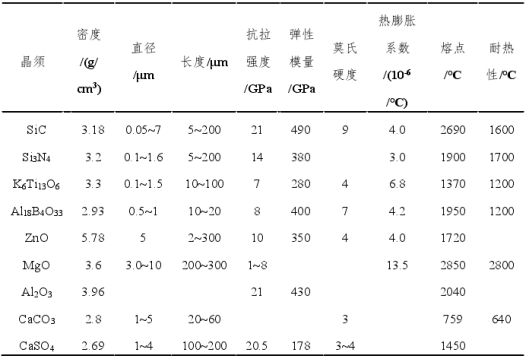 主要無機(jī)晶須物理參數(shù)