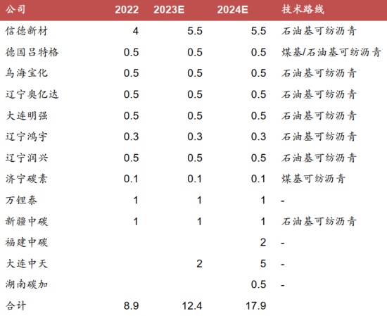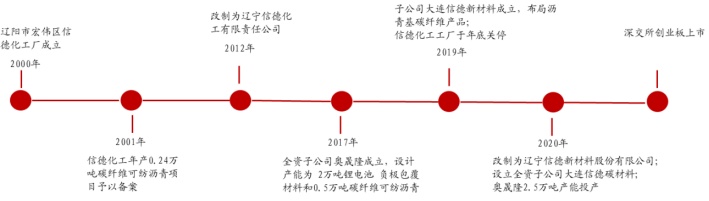 信德新材成立之初經(jīng)營碳纖維可紡瀝青,工廠位于遼陽,產(chǎn)能0.24萬噸,已于2019年底關停。公司在大連下設三家全資子公司,公司于2017年在大連長興島設立的奧晨隆,其設計產(chǎn)能為2萬噸鋰電池負極包覆材料和0.5萬噸碳纖維可紡瀝青,2020年投產(chǎn);公司于2019年成立大連信德新材料(于2020年6月變更為全資子公司),布局瀝青基碳纖維產(chǎn)品;公司于2020年成立大連信德碳材料,為IPO募投項目“年產(chǎn)3萬噸碳材料產(chǎn)業(yè)化升級建設項目”的實施主體,在擴大產(chǎn)能的同時,向上游延伸產(chǎn)業(yè)鏈至更易得的大宗商品乙烯焦油。