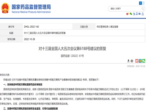 您提出的《關(guān)于加強(qiáng)中藥配方顆粒質(zhì)量標(biāo)準(zhǔn)制定保障中藥配方顆粒產(chǎn)業(yè)健康持續(xù)發(fā)展的建議》收悉,現(xiàn)答復(fù)如下: