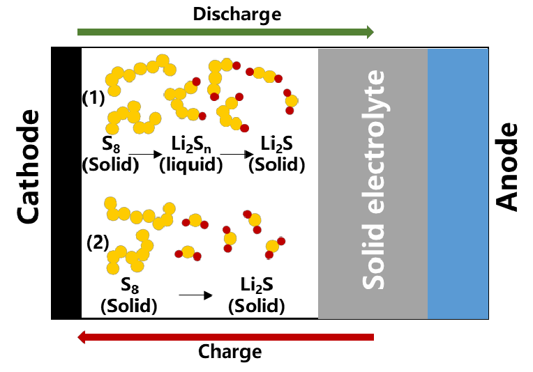 液態(tài)鋰硫電池與固態(tài)鋰硫電池的充放電機(jī)理示意圖(來源:李文文,《PEO基聚合物電解質(zhì)的改性及其全固態(tài)鋰硫電池界面研究》)