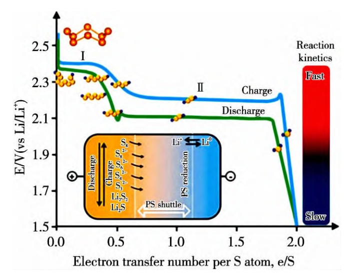 鋰硫電池理想的充放電曲線(插圖為穿梭效應(yīng))(來源:馮陽等,《高性能鋰硫電池研究進(jìn)展與改進(jìn)策略》)