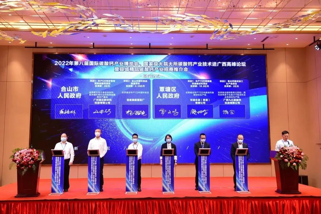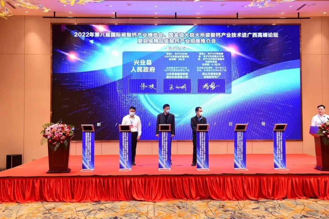由覃塘區(qū)政協(xié)覃文暉副主席與華潤水泥(貴港)有限公司廖懷東副總經(jīng)理,簽訂投資18.8億元建設“年產(chǎn)75萬噸高端鈣基新材料項目”協(xié)議;與廣西九億碳酸鈣科技有限公司蔣金董事長,簽訂投資2億元建設“氧化鈣精深加工生產(chǎn)線項目”協(xié)議。