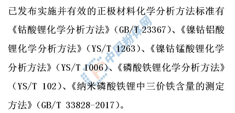 已發(fā)布實施并有效的前驅(qū)體化學(xué)分析方法標(biāo)準(zhǔn)有《四氧化三鈷化學(xué)分析方法磁性異物含量測定磁選分離-電感耦合等離子體發(fā)射光譜法》(YS/T 1057)、《粗氫氧化鈷化學(xué)分析方法》(YS/T 1157)、《鎳鈷錳三元素復(fù)合氧化物化學(xué)分析方法硫量的測定高頻感應(yīng)爐燃燒紅外吸收法》(YS/T 1058)、《鎳鈷錳三元素氫氧化物化學(xué)分析方法》(YS/T 928)、《二次電池廢料化學(xué)分析方法》(YS/T 1342)、《摻雜型鎳鈷錳三元素復(fù)合氫氧化物化學(xué)分析方法》(YS/T 1339)。