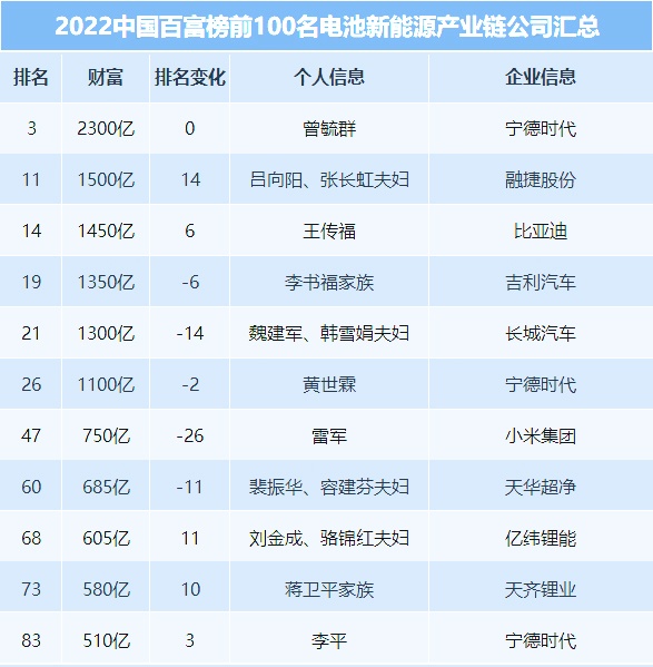據(jù)統(tǒng)計(jì),2022胡潤(rùn)百富榜前100名中,寧德時(shí)代、融捷股份、比亞迪、吉利汽車、長(zhǎng)城汽車、小米集團(tuán)、天華超凈、億緯鋰能、天齊鋰業(yè)9家電池新能源產(chǎn)業(yè)鏈企業(yè)、11人上榜,財(cái)富總額超1.21萬億。