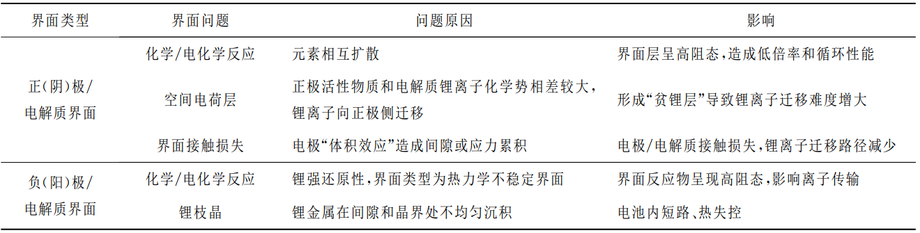 硫化物固態(tài)電解質相對較高的室溫離子電導率使得其成為固態(tài)電池重要的備選材料。進一步提高硫化物固態(tài)電解質穩(wěn)定性是發(fā)揮其在離子電導率方面優(yōu)勢的關鍵。硫化物固態(tài)電池內部存在的界面問題制約著其應用。常見的界面問題如表2所示,界面問題的存在使得硫化物全固態(tài)電池極化嚴重、容量低、循環(huán)能力差等問題更加突出。