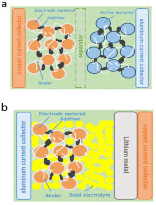 圖3a.傳統(tǒng)的鋰離子電池結構示意圖b.硫化物全固態(tài)電池結構示意圖