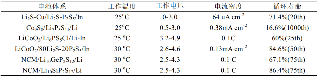 由于硫化物全固態(tài)電池還沒有實現(xiàn)商業(yè)化,表3為近年來部分高校與科研單位研制的硫化物全固態(tài)電池結果,表中有電池體系、工作溫度以及電池的循環(huán)性能。由于目前各實驗室內的全固態(tài)電池在正極活性物質/固態(tài)電解質配比,固態(tài)電解質層厚度以及電池組裝方法上都有較大差異,因此實驗結果僅有部分參考價值。從表中可以看出,目前硫化物全固態(tài)電池的實驗室產品循環(huán)性能較差,大部分都在100圈以下,界面處理、電池組裝工藝以及固態(tài)電解質本身都需要進一步優(yōu)化。