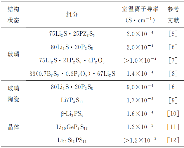 硫化物固體電解質(zhì)按結(jié)晶形態(tài)可分為硫化物玻璃、玻璃陶瓷固體電解質(zhì)及晶體固體電解質(zhì)。其中,玻璃陶瓷可由玻璃經(jīng)過退火處理后獲得,晶體類可以由異價元素取代獲得。表1給出各主要類型硫化物固體電解質(zhì)代表及其室溫下電導(dǎo)率。