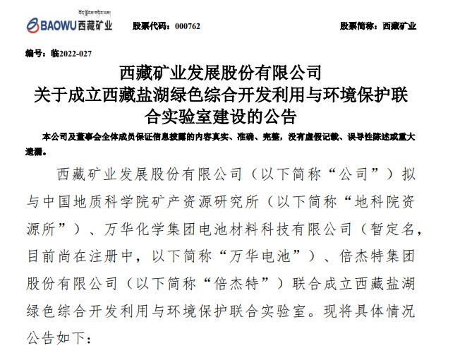 11月14日,西藏礦業(yè)公告稱,擬與中國(guó)地質(zhì)科學(xué)院礦產(chǎn)資源研究所、萬華化學(xué)集團(tuán)電池材料科技有限公司、倍杰特聯(lián)合成立西藏鹽湖綠色綜合開發(fā)利用與環(huán)境保護(hù)聯(lián)合實(shí)驗(yàn)室。