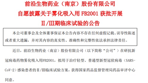 中國粉體網(wǎng)訊 近日,前沿生物藥業(yè)(南京)股份有限公司(“公司”)在研抗新冠病毒藥物霧化吸入用FB2001,擬用于治療輕型、普通型新型冠狀病毒(SARSCoV-2)感染患者的Ⅱ/Ⅲ臨床試驗(yàn)方案,獲得國家藥品監(jiān)督管理局藥品審評中心同意。