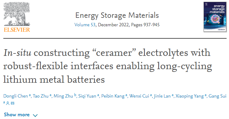 中國(guó)粉體網(wǎng)訊 近日,北京化工大學(xué)楊小平、隋剛教授課題組在國(guó)際知名期刊Energy Storage Materials(影響因子:20.831)上發(fā)表題為“In-situ constructing ‘ceramer’ electrolytes with robust-flexible interfaces enabling long-cycling lithium metal batteries”的研究工作。