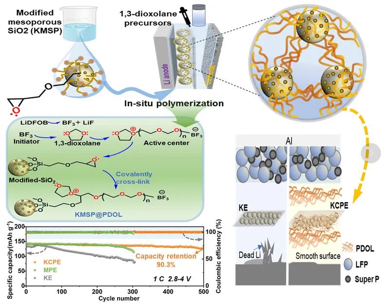 具有商用聚烯烴隔膜和液體電解質(zhì)的鋰金屬電池(LMB)的壽命和安全性會(huì)因鋰枝晶以及液體電解質(zhì)的泄漏和燃燒而劣化。因此,迫切需要設(shè)計(jì)開(kāi)發(fā)出一種多功能的電解質(zhì)材料來(lái)同時(shí)克服上述問(wèn)題,以開(kāi)發(fā)高安全、高性能鋰金屬電池。本工作中,將末端環(huán)氧化的介孔SiO2涂覆于聚烯烴隔膜上,并通過(guò)原位聚合的工藝實(shí)現(xiàn)液態(tài)電解質(zhì)的原位固化和PDOL與SiO2的共價(jià)鍵橋接,得到“Ceramer”固態(tài)電解質(zhì)。致密的介孔SiO2層具有豐富的孔隙結(jié)構(gòu)顯著提高電解液的浸潤(rùn)性能,SiO2的Lewis酸位點(diǎn)有利于促進(jìn)鋰鹽的解離,提高離子電導(dǎo)率。共價(jià)交聯(lián)后的電解質(zhì)模量可達(dá)2.3 GPa,具有優(yōu)異的熱穩(wěn)定性。SiO2顆粒之間的空隙被導(dǎo)鋰性能優(yōu)異的高分子量PDOL填充,交織形成均勻且剛?cè)岵?jì)的導(dǎo)鋰網(wǎng)絡(luò)。制備的電解質(zhì)具有較高的離子電導(dǎo)率(1.2 mS cm-1)和離子遷移數(shù)為(0.71),在Li//Cu并表現(xiàn)出非常穩(wěn)定的沉積/脫沉積行為(庫(kù)倫效率可達(dá)98%)。其高的離子遷移數(shù)可以減輕極化并減少Li的不均勻成核;SiO2的高模量有利于物理抑制鋰枝晶;PDOL通過(guò)交聯(lián)反應(yīng)在SiO2表面緊密橋接,填充SiO2納米顆粒之間的空隙,消除存在的薄弱環(huán)節(jié)。