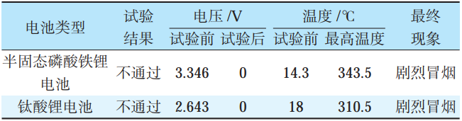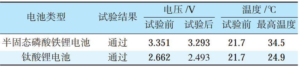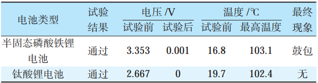短路試驗中,兩種電池的最大短路電流均大于800A,最大溫升在100K左右,半固態(tài)磷酸鐵鋰電池存在明顯鼓包現(xiàn)象,鈦酸鋰電池?zé)o明顯表現(xiàn)現(xiàn)象。
