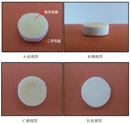 Gioumouxouzis等將二甲雙胍和格列美脲分別嵌入尤特奇緩釋層和聚乙烯醇緩釋層中,制成抗糖尿病的雙相釋藥系統(tǒng)(如圖),兩種藥物均可在預(yù)期的時(shí)間內(nèi)完全釋放,表明3D打印技術(shù)可為多藥聯(lián)用的治療方案定制固體制劑。