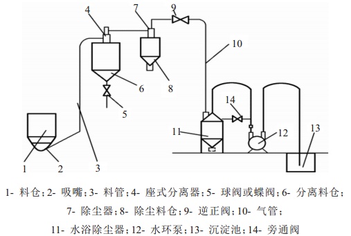 真空輸送系統(tǒng)原理如上圖所示,系統(tǒng)中主要包含料倉、吸嘴、座式分離器、分離料倉、除塵器、水環(huán)泵等部件。